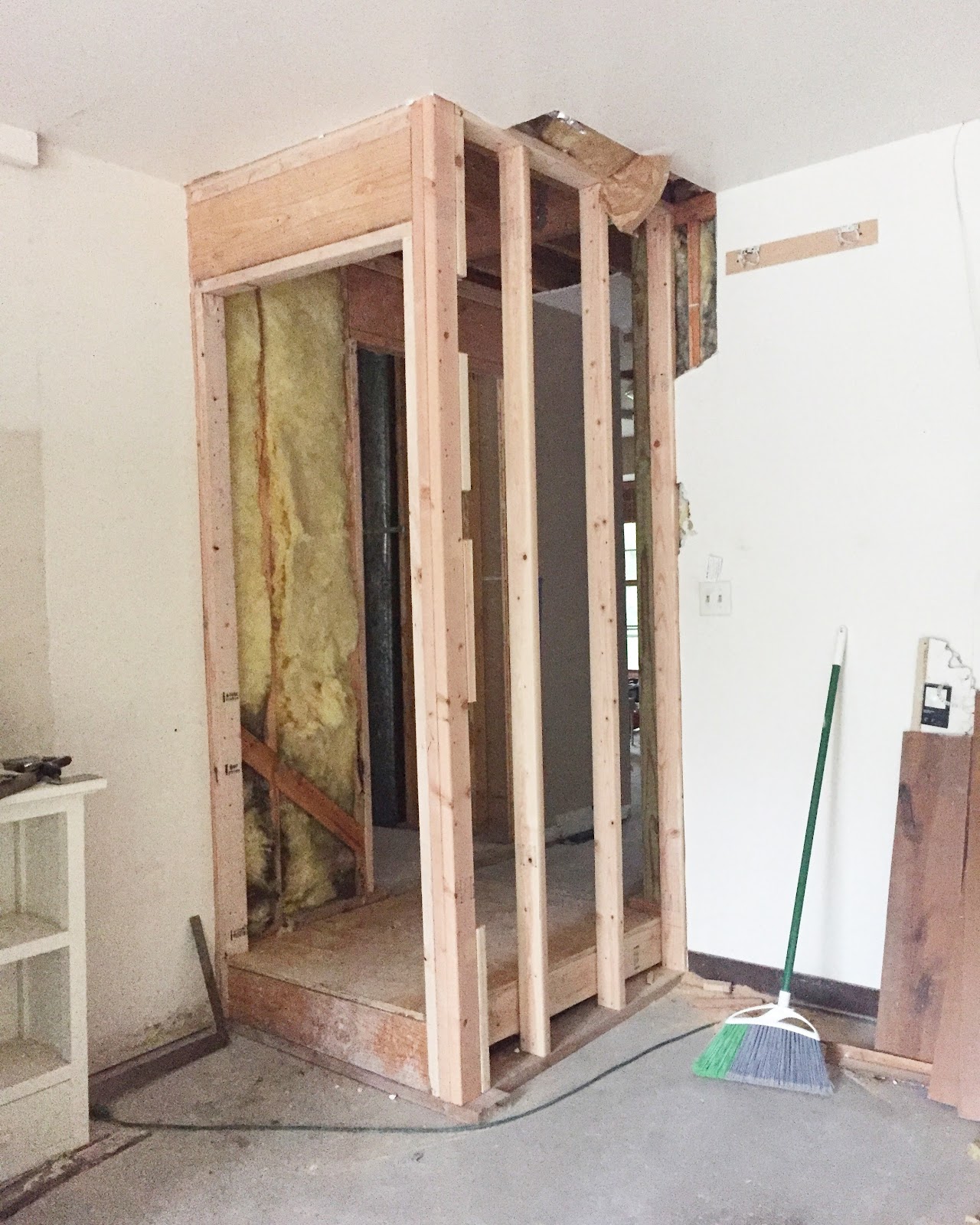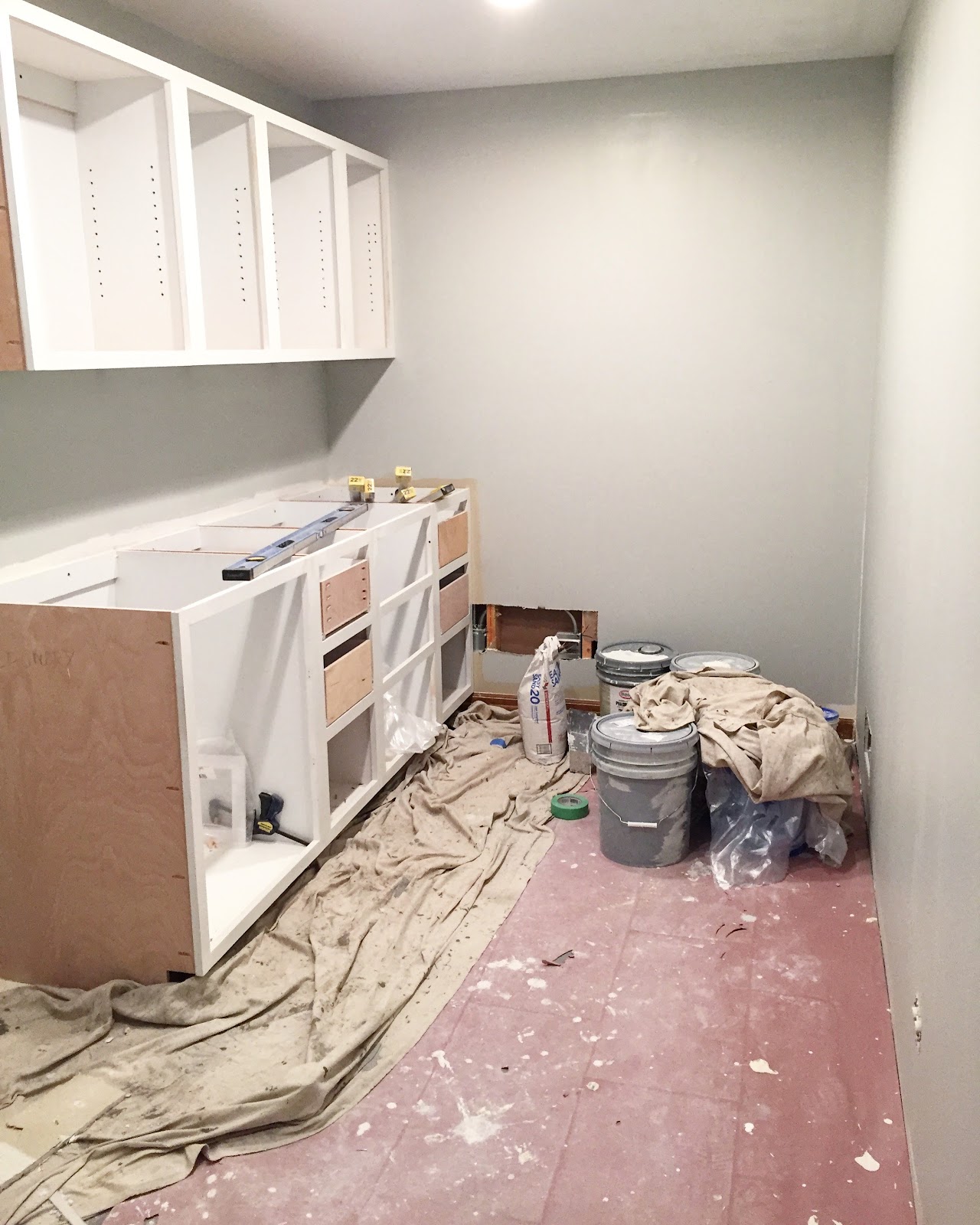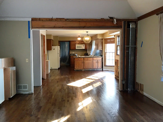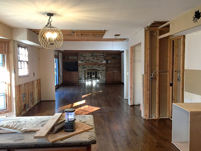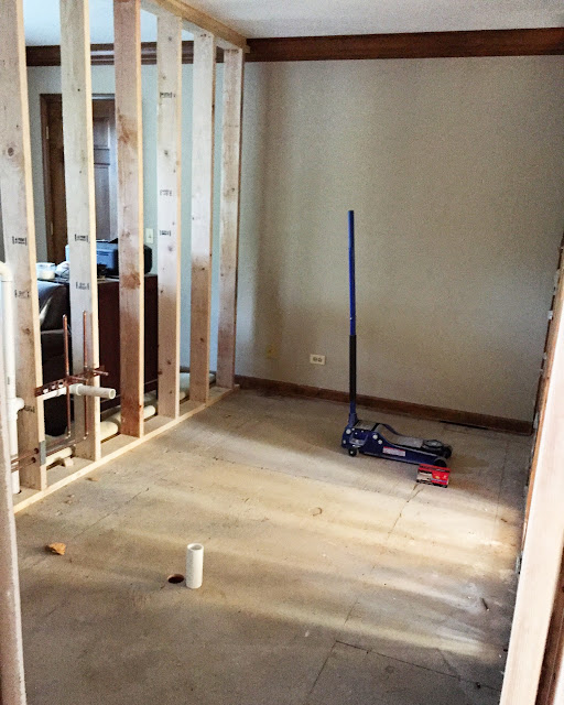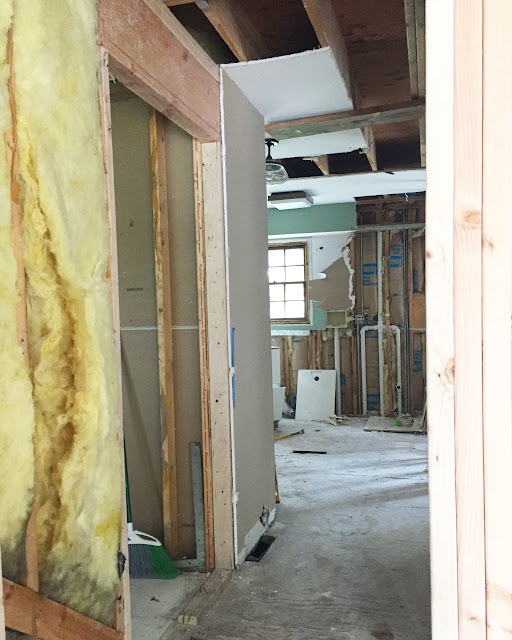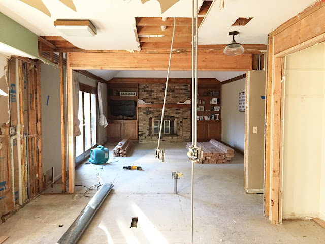 The vision for this space is to have the washer and dryer installed in the left, lower corner of the above photo with a large bar installed above for hanging clothes. Then there will be a wall of cabinets with upper and lowers and a sink with butcher block counters. On the right side of this room we will eventually build "lockers" of some sort but for now we will just throw up some hooks on the wall and a bench below. I'm a little sad that this space has no natural light but it is a small price to pay to have a larger laundry room and more designated mudroom (instead of the tiny hallway I had before) and we can't forget that giant open space between the kitchen and family room.