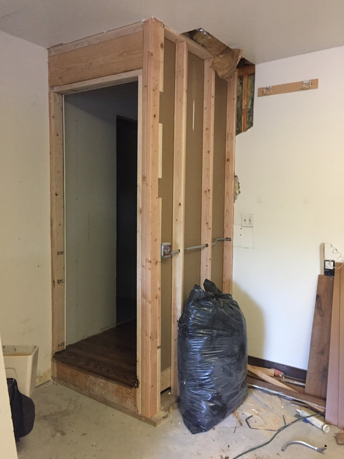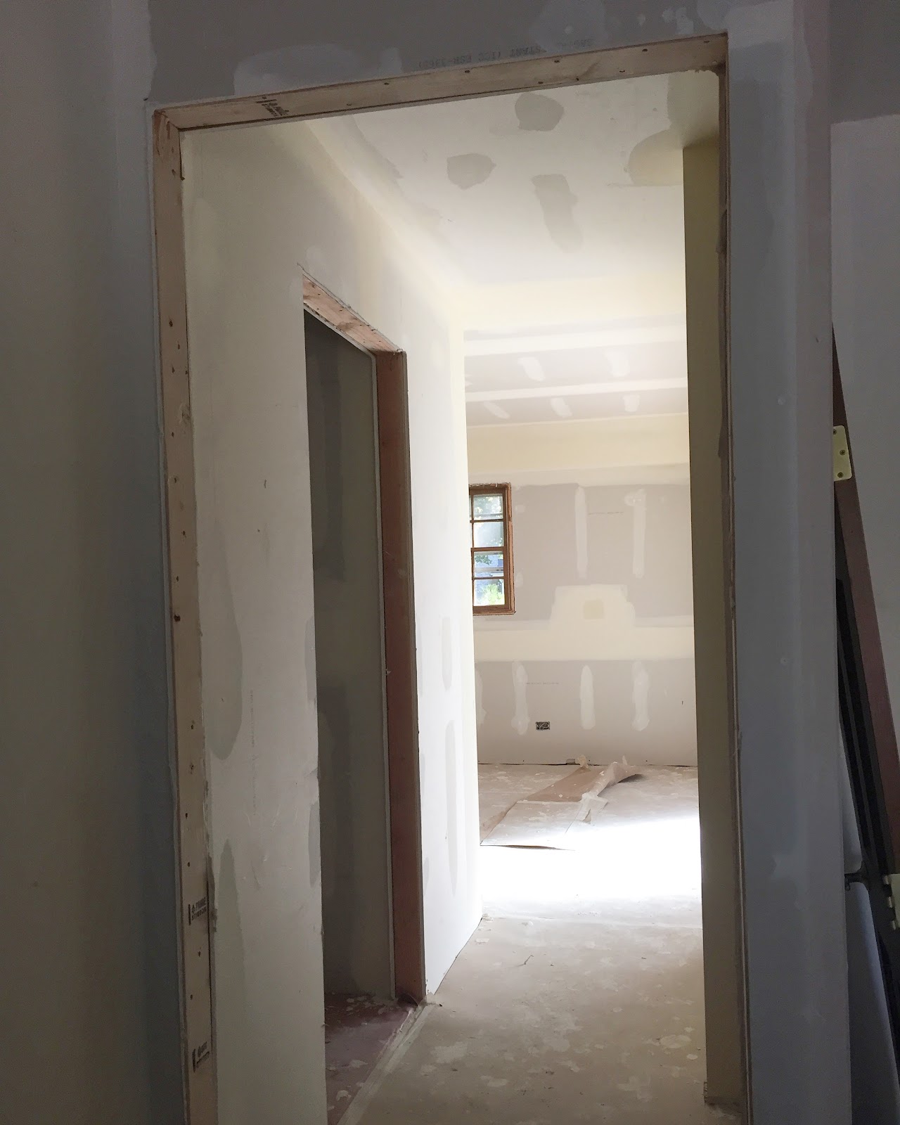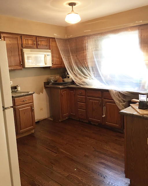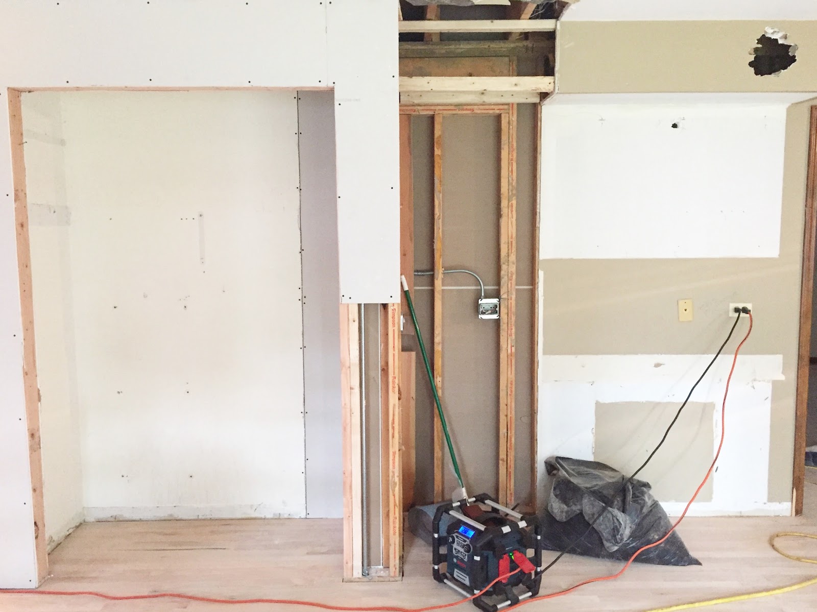 The vision for this space is to have the washer and dryer installed in the left, lower corner of the above photo with a large bar installed above for hanging clothes. Then there will be a wall of cabinets with upper and lowers and a sink with butcher block counters. On the right side of this room we will eventually build "lockers" of some sort but for now we will just throw up some hooks on the wall and a bench below. I'm a little sad that this space has no natural light but it is a small price to pay to have a larger laundry room and more designated mudroom (instead of the tiny hallway I had before) and we can't forget that giant open space between the kitchen and family room.