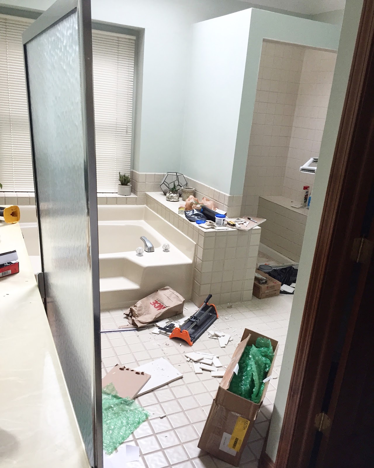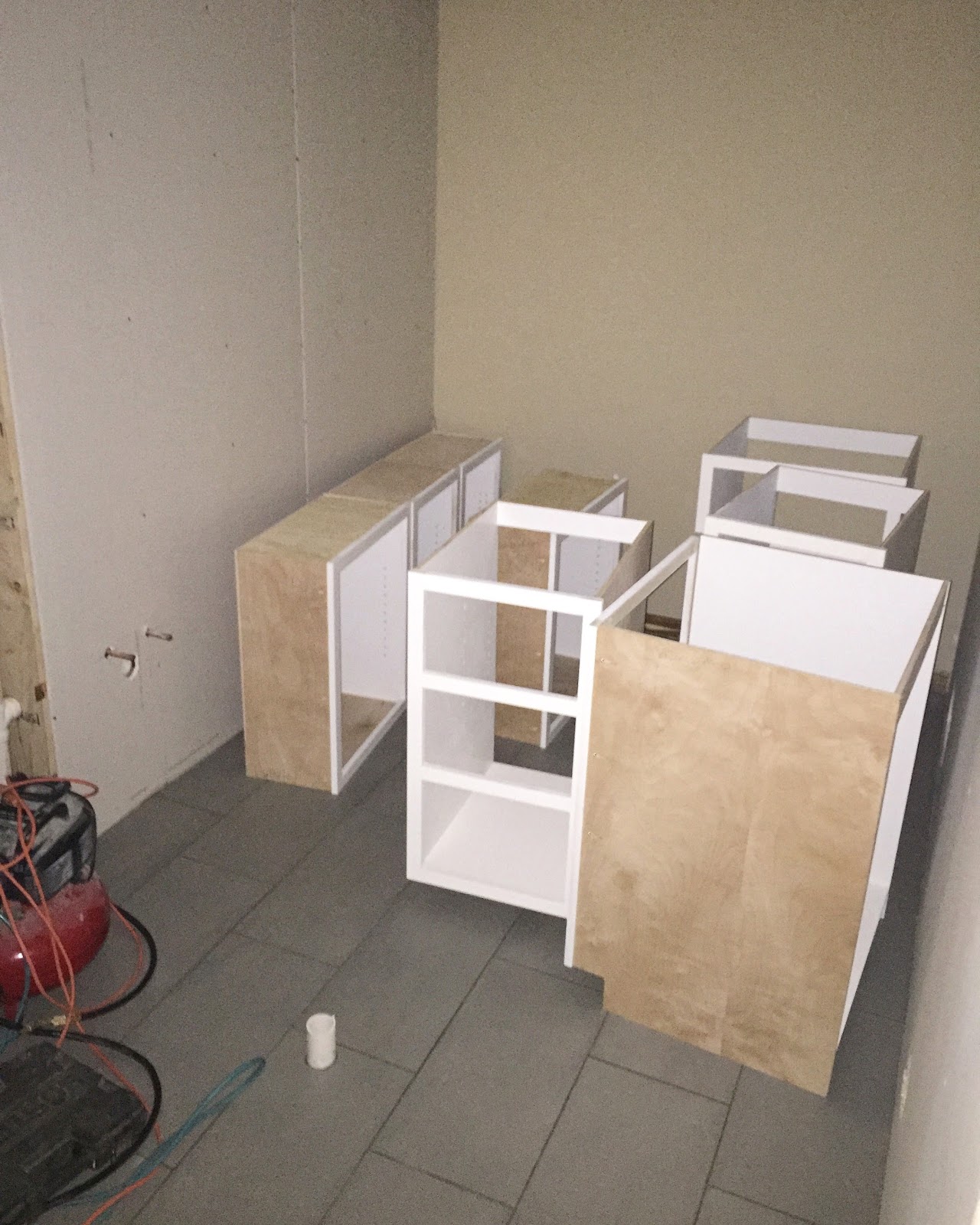 The laundry/mudroom space has been hard to photograph since the electrician hasn't gotten the overhead lighting in yet but the tilers were still somehow able to finish the floor. And the cabinets are in and waiting to be installed.
